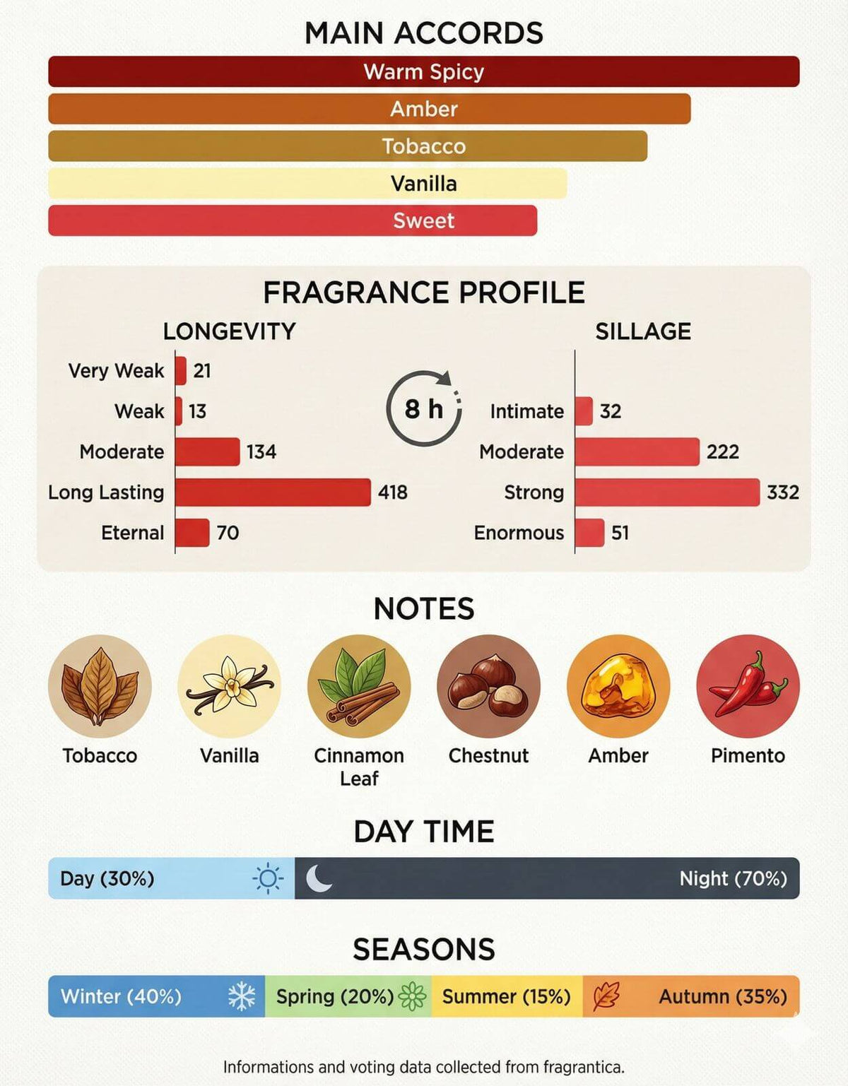 • Heart Notes: The star of the show—warm Tobacco leaf blended with sweet Chestnut and fiery Chili Pepper.