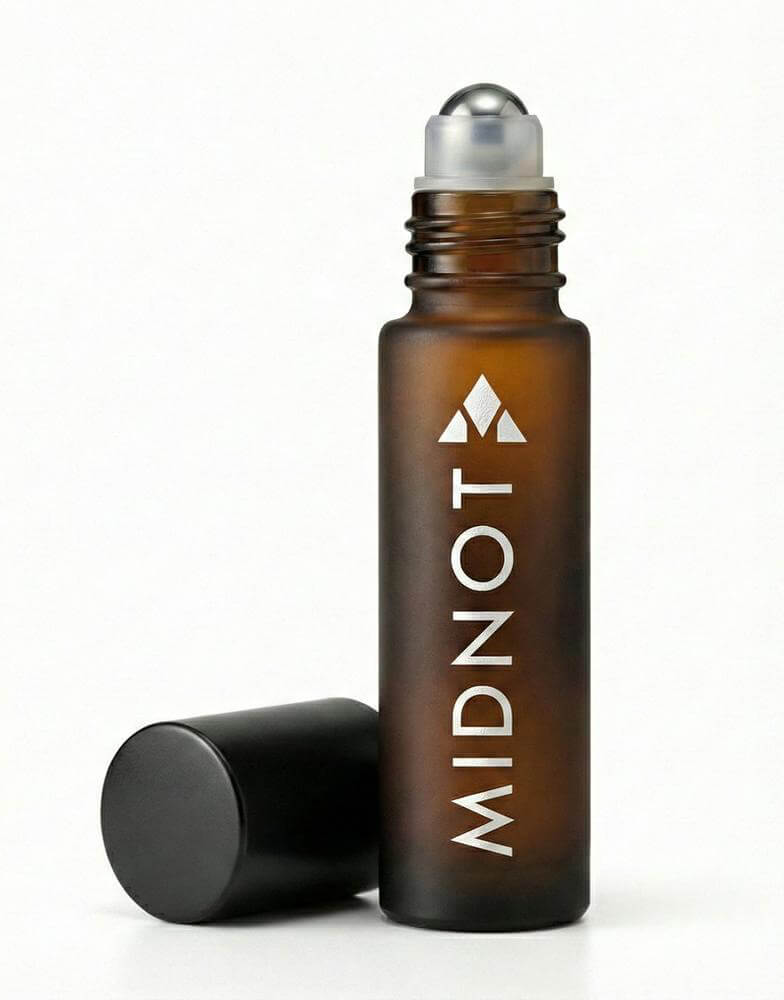 Each perfume oil comes in a matte-finish frosted amber bottle, paired with a rich wooden-textured cap that adds a warm, natural, and luxurious touch. The minimalist vertical MIDNOT branding and clean typography enhance the premium aesthetic, making the bottle look elegant, modern, and perfect for display.